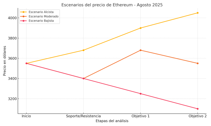 - Escenario moderado: Si ETH se mantiene entre 3,400-3,680 dólares reflejaría un período de equilibrio en espera de nuevos catalizadores.