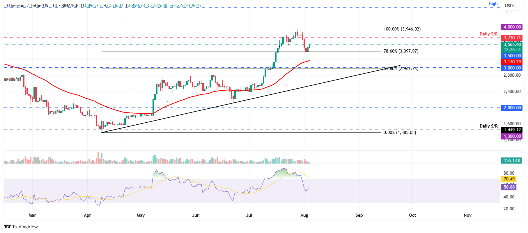 El domingo, ETH se recuperó ligeramente tras encontrar soporte alrededor de su nivel de retroceso de Fibonacci del 78.6% en 3.392$, trazado desde el mínimo de abril de 1.374$ hasta el máximo de julio de 3.946$. Al momento de escribir el lunes, continúa su recuperación, cotizando por encima de 3.500$.