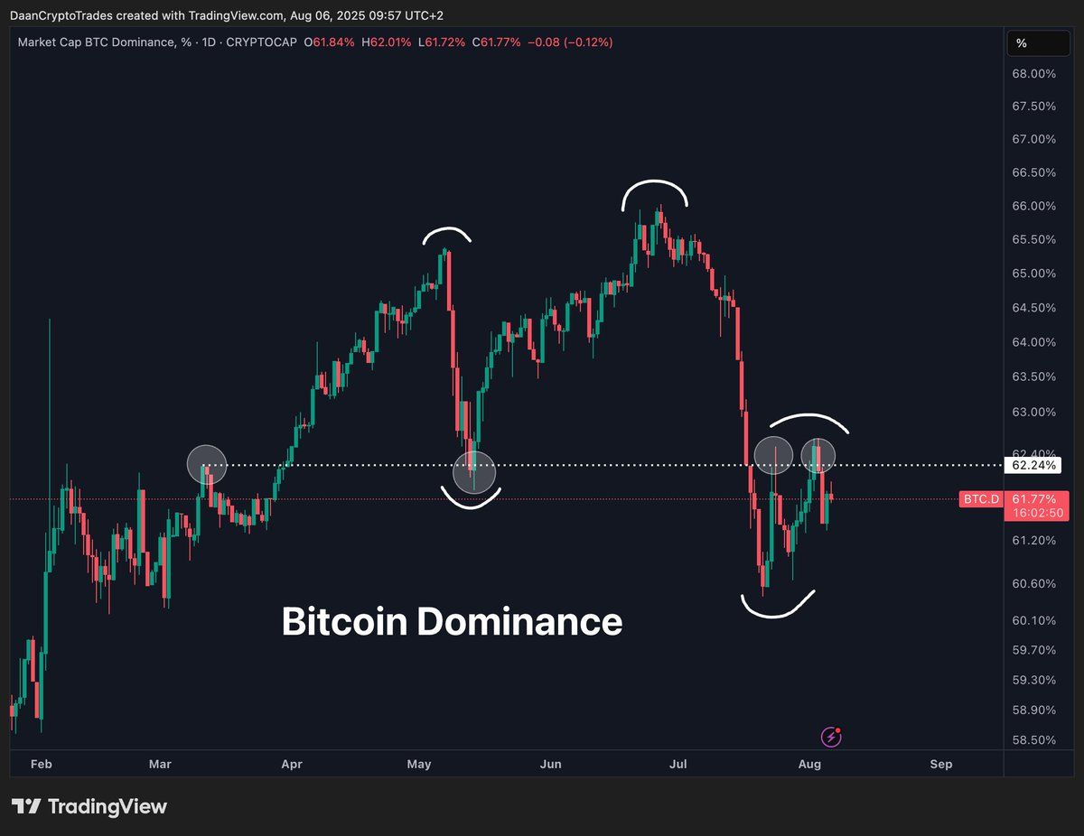 Dicho esto, la zona actual del 62% para BTC.D es un umbral sensible. El analista Daan advirtió que si BTC.D rompe por encima de este nivel, el mercado podría volver a favorecer a Bitcoin. En ese caso, ETH podría continuar teniendo un rendimiento inferior en comparación.