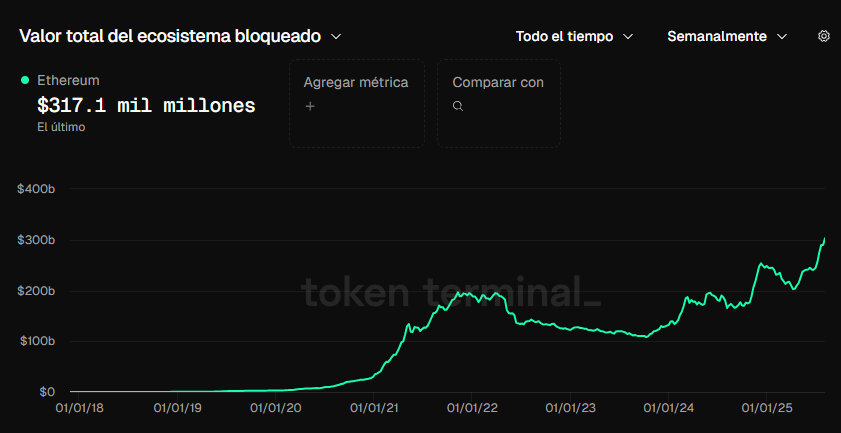 El valor total bloqueado (TVL) de Ethereum también alcanzó un nuevo ATH, superando los USD 300 mil millones el 10 de agosto y situándose actualmente en USD 317 mil millones, según datos de Token Terminal.