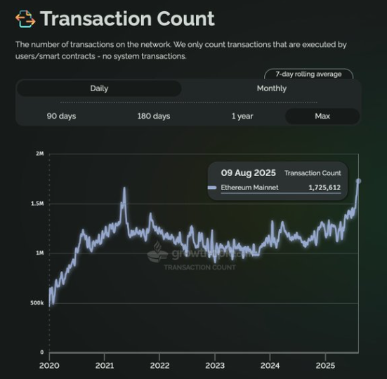 El 9 de agosto, la capa base (L1) de Ethereum registró más de 1.7 millones de transacciones en un solo día, la cifra más alta desde su creación, según el sitio Grow the Pie, como se ve en la siguiente imagen: