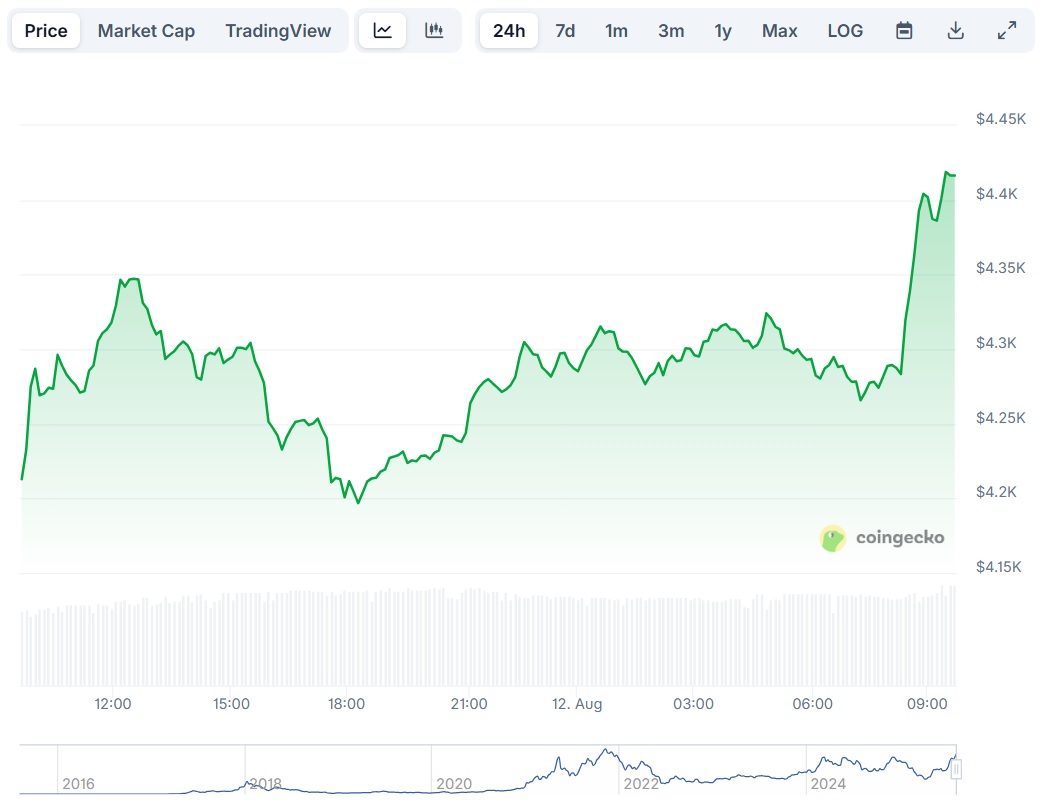 La segunda criptomoneda más grande por capitalización de mercado surgió a un nivel de USD $4.400, visto por última vez en noviembre de 2021, el martes por la mañana mientras se aseguraba un aumento superior a 5% en el día, según datos de CoinGecko.