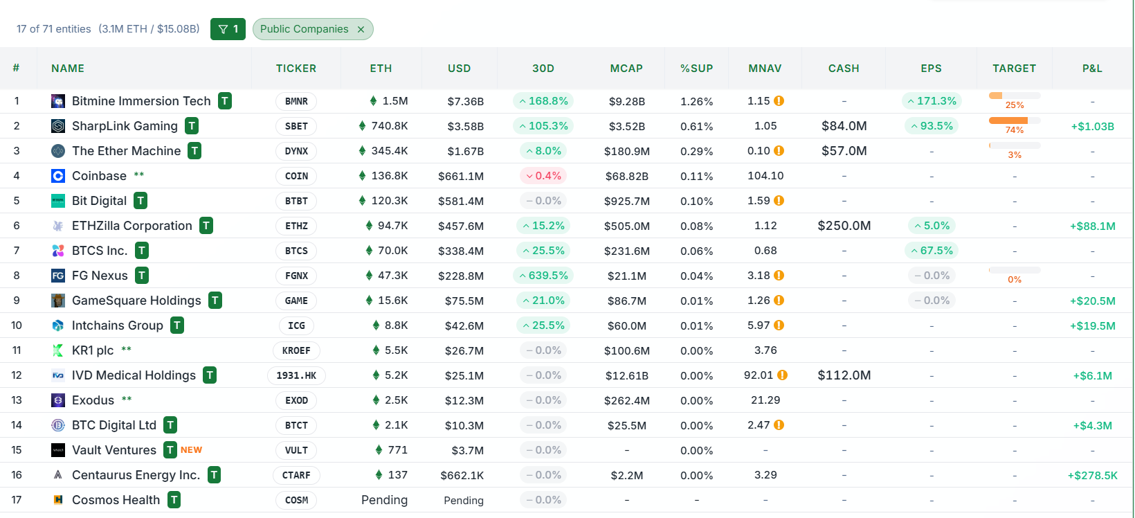 Existen diecisiete grandes empresas de reservas de ETH que cotizan en bolsa, una estrategia inspirada por la empresa de Michael Saylor, Strategy. Este enfoque de inversión alimenta los precios de las acciones, permitiendo a las empresas ganar miles de millones a través de más emisiones, flujos de efectivo, compras y aumentos. Las empresas que comenzaron a acumular en junio ahora poseen más de 3,1 millones de Ether, valorados en más de $15 mil millones. El objetivo es alcanzar $70 mil millones, lo que sugiere que se podría comprar significativamente más ETH si las ventas planificadas de acciones avanzan sin problemas.