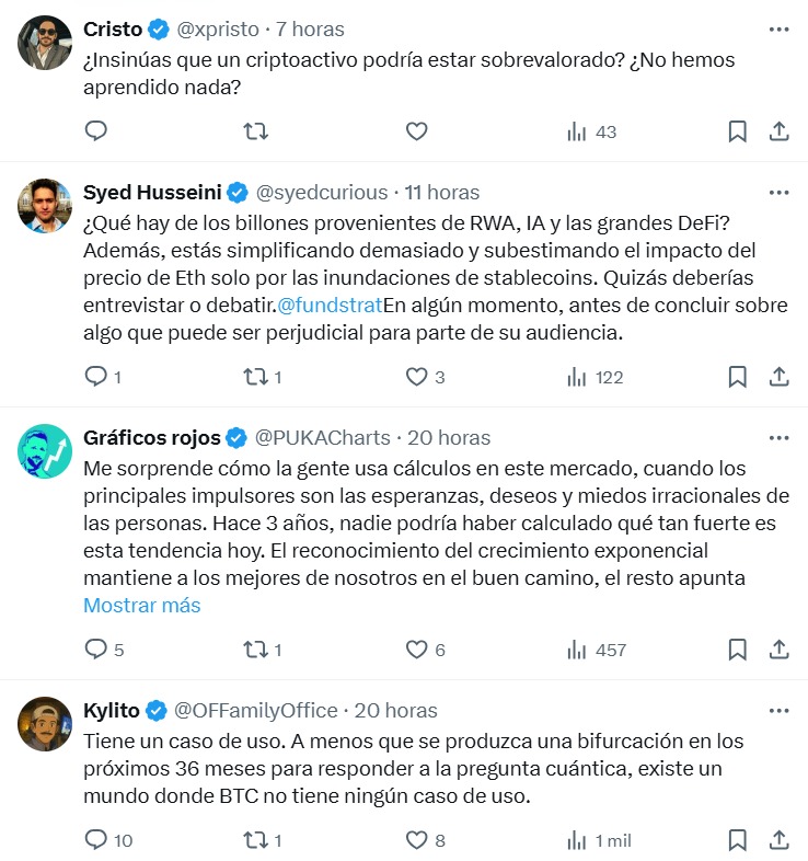 La publicación desató un debate inmediato. Algunos usuarios coincidieron en que el planteo ayuda a dimensionar el techo de mercado de ETH y que esa misma lógica podría aplicarse a otras cadenas como Solana. Otros, en cambio, señalaron que el valor de ether no se reduce a las stablecoins ni a las comisiones, sino que también reside en su función como red segura para aplicaciones financieras.