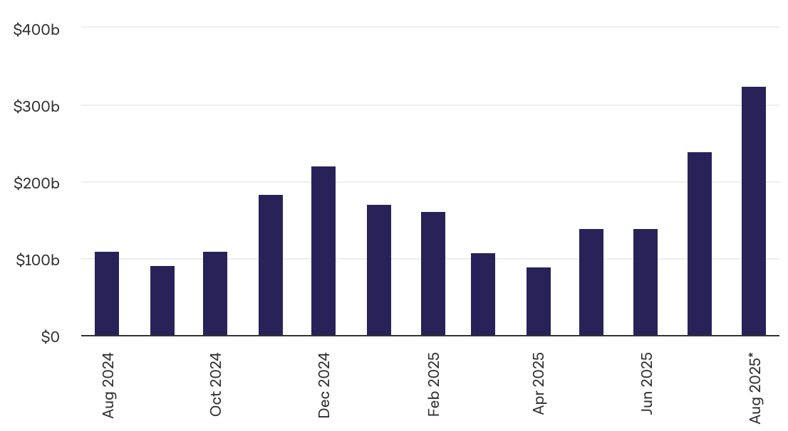 Además, el número de transacciones de Ethereum en un período de 30 días alcanzó un nuevo máximo. El recuento mensual de direcciones activas alcanzó su segundo nivel histórico más alto. Contribuyendo a este escenario estuvo la acumulación de ETH por entidades institucionales. A principios de hacesto, se estimaban las reservas institucionales de ETH en alrededor de 4 mil millones de dólares, saltando a más de 12 mil millones a finales del mes, impulsadas en gran parte por grandes adquisiciones de compañías como BitMine Immersion y SharpLink Gaming.