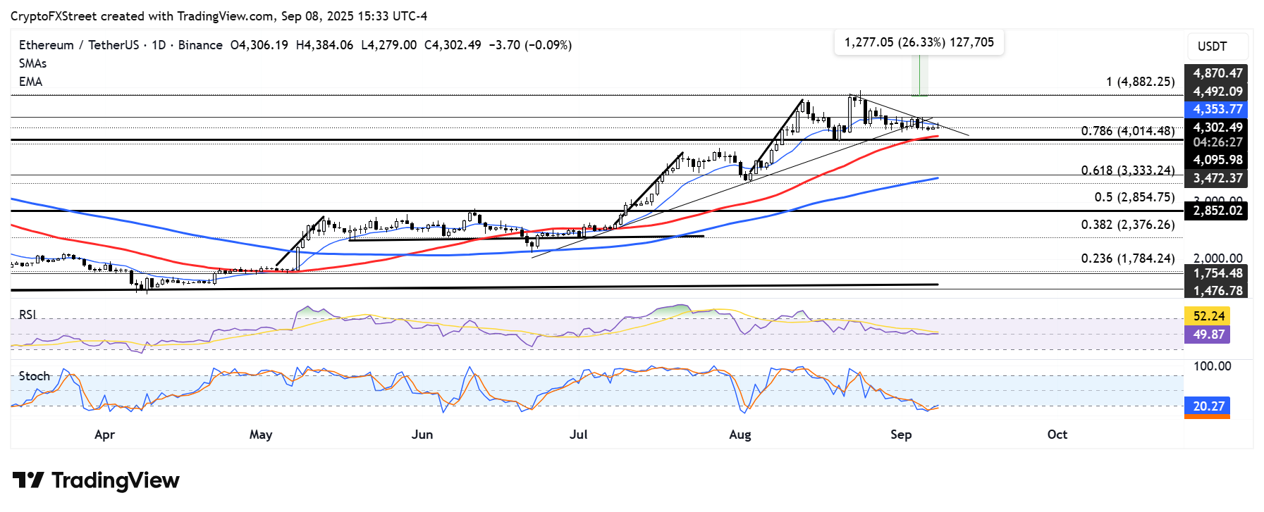 ETH se ha consolidado en gran medida dentro del rango de 4.100$ a 4.500$ durante el último mes, cotizando fuera del área solo en algunas ocasiones. Como resultado, ETH ha formado un patrón de triángulo descendente en el gráfico diario, marcado por una línea de tendencia a la baja que se extendió desde el 22 de agosto.