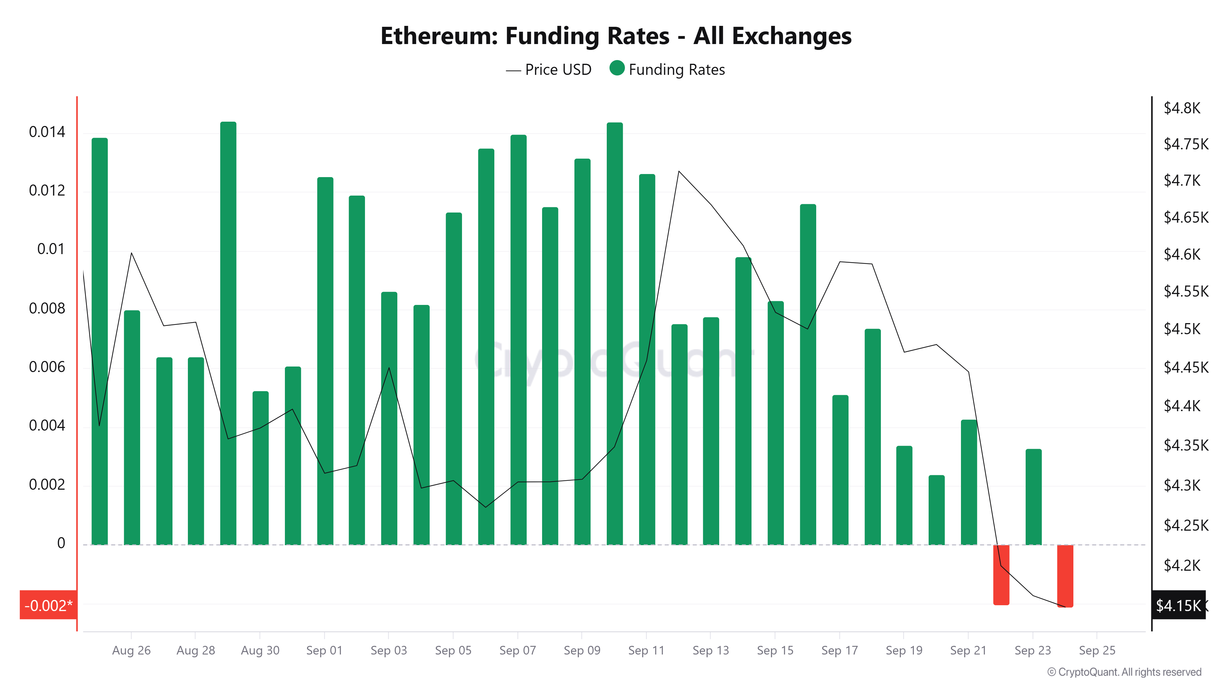 - Las tasas de financiación de Ethereum han disminuido considerablemente, mostrando un signo negativo por segunda vez en la última semana.
