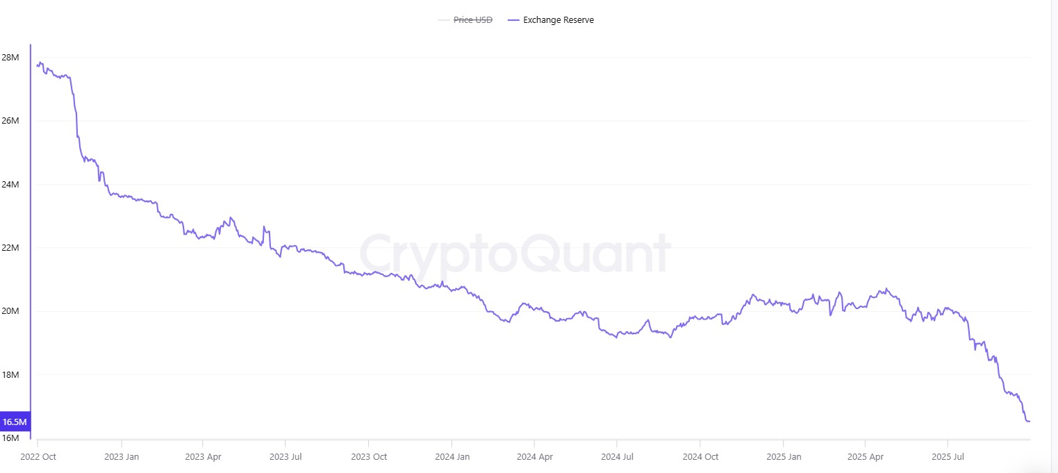 Tal como se muestra en la siguiente gráfica provista por la firma CryptoQuant, hay tan solo 16,5 millones de ETH disponibles en las plataformas de intercambio, el número más bajo registrado desde 2022.