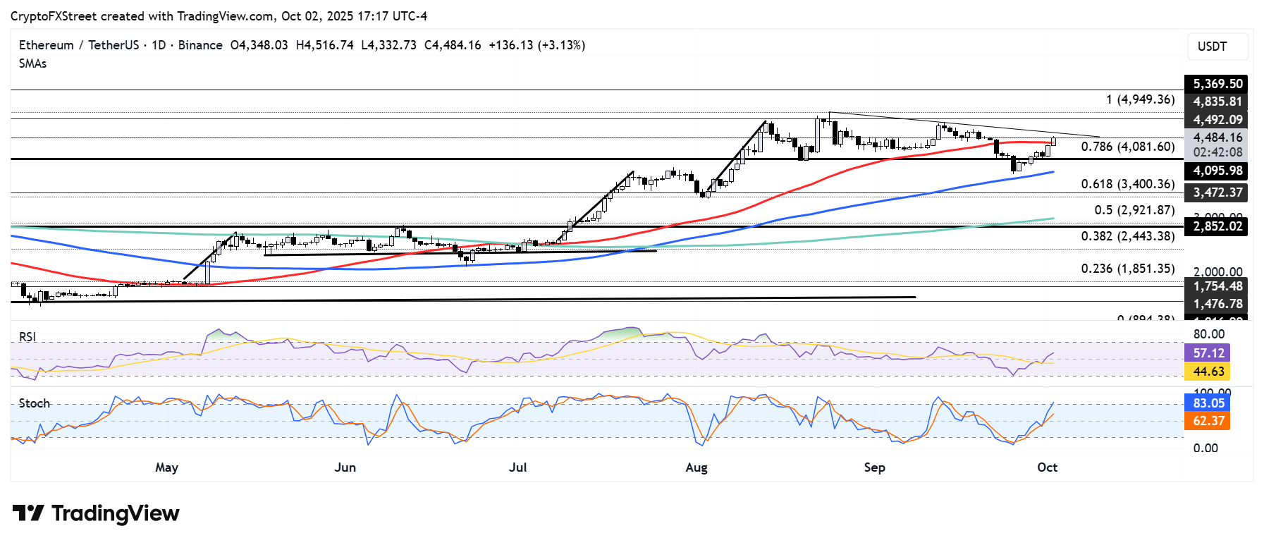 Pronóstico del Precio de Ethereum: ETH prueba la resistencia de 4.500$ tras superar la SMA de 50 días