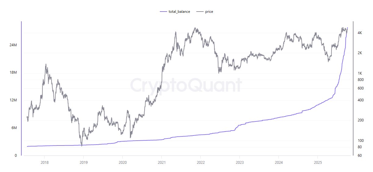 De acuerdo con datos de CryptoQuant, solamente en una semana estos grandes inversores compraron 800.000 ETH. Se trata de una continuación de una tendencia de acumulación que se inició en septiembre y se extiende hasta este mes de octubre, según el citado portal.