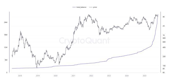 Según datos de Criptotendencia, estos ciclos de acumulación suelen anticipar tendencias alcistas. Ya que las ballenas muestran una clara señal de acumulación alcanzando los 27.82 millones de ETH por parte de estos grandes inversores. Permitiendo que Ethereum cotice alrededor de los 4.600 dólares.