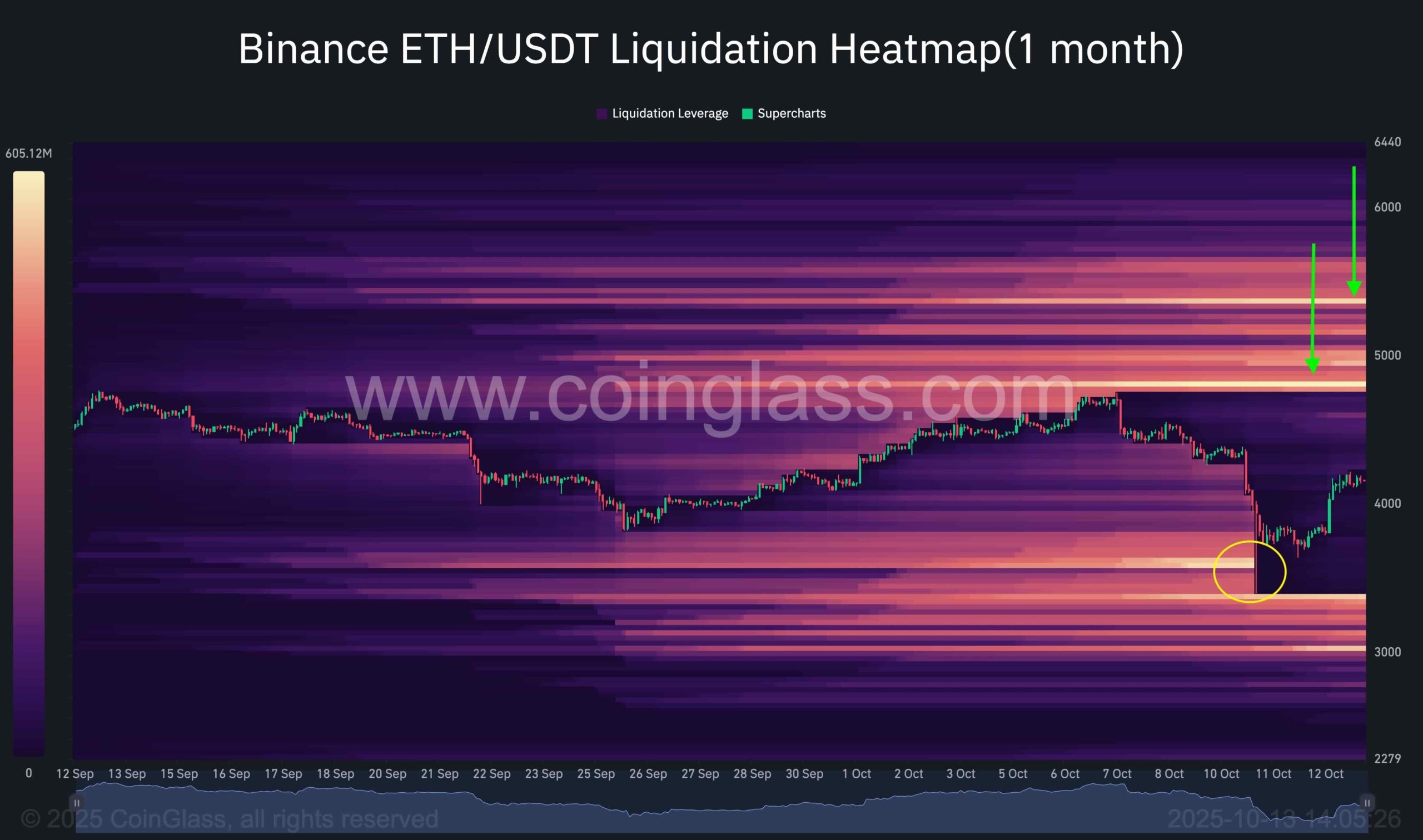El último mapa de calor de liquidación de Binance a 1 mes revela cómo la caída impulsada por factores macroeconómicos de la semana pasada remodeló el panorama de los derivados. Un clúster masivo de liquidación se formó entre 3.400 y 3.600, marcando la limpieza de posiciones largas altamente apalancadas, ya que Ethereum cayó brevemente por debajo de 3.500. Este evento sirvió como una fase de depuración para el posicionamiento del mercado, eliminando las posiciones largas débiles y restableciendo tanto el sentimiento como las condiciones de financiación.
