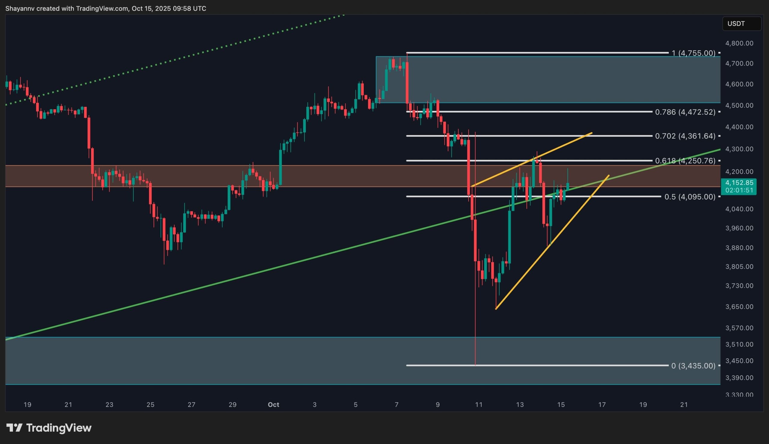 La estructura de 4 horas revela que Ethereum está formando un patrón de cuña ascendente tras su fuerte rebote en forma de V desde el mínimo de $3.400. El activo ahora se está negociando cerca de la zona de retroceso de Fibonacci 0.618 alrededor de $4.250, que se superpone con la antigua área de ruptura ($4.200–$4.300), lo que la convierte en un punto de decisión clave para la dirección a corto plazo.