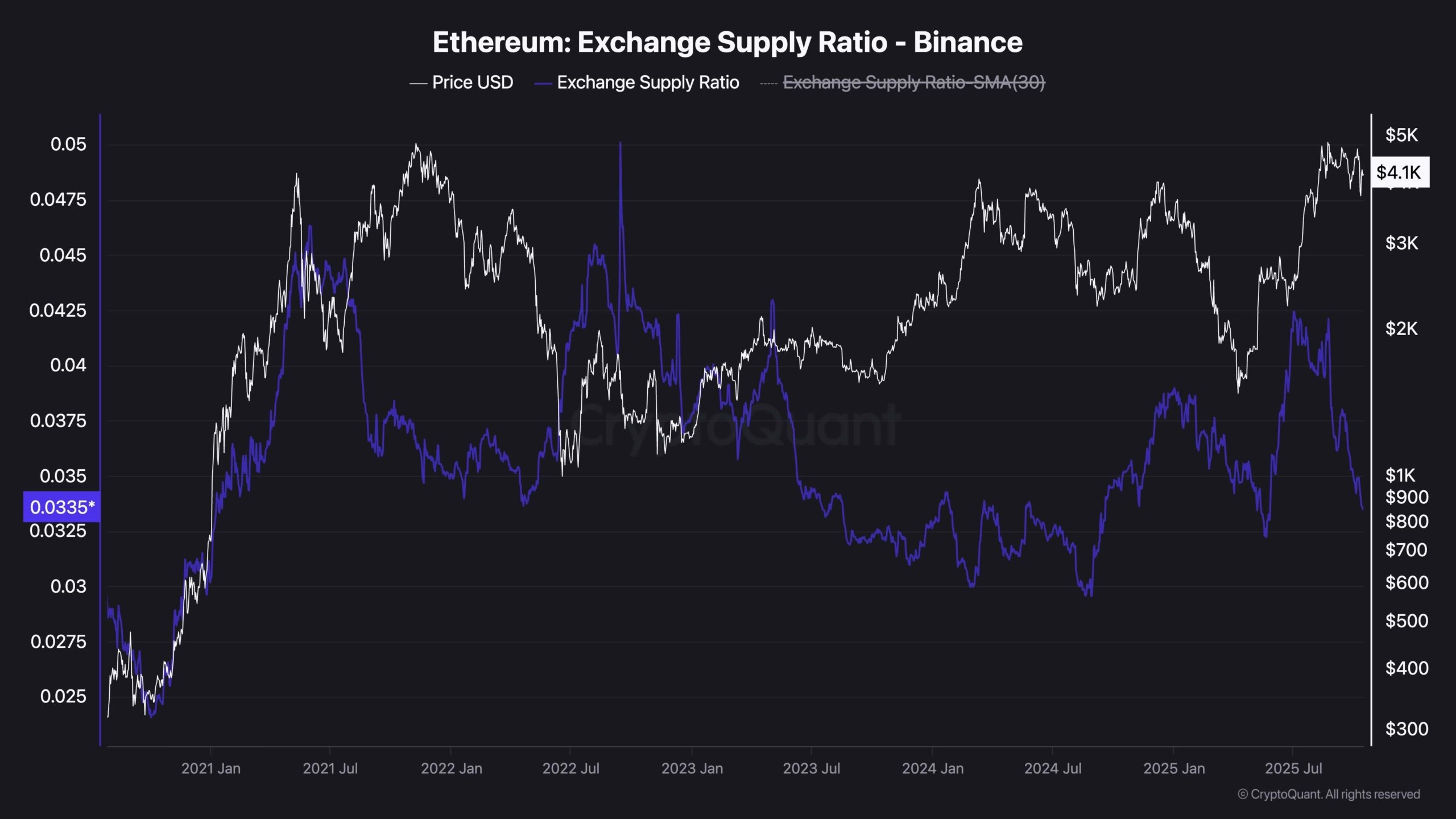 Los datos on-chain de Binance, la plataforma de trading de Ethereum más grande, muestran una fuerte disminución en la relación de suministro de ETH en exchanges, que ha caído a 0,33, acercándose a sus niveles más bajos desde mayo. Esta caída se produce después de un breve repunte en los saldos de los exchanges durante el período en que Ethereum se estaba estabilizando alrededor de $4.000.