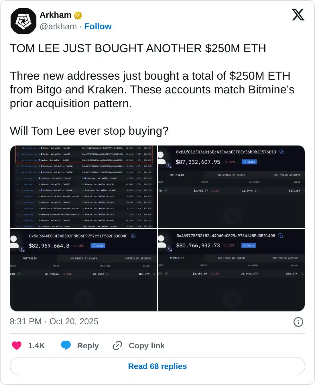 Poco después de su comunicado, datos de la plataforma de análisis cripto Arkham Intelligence muestran que BitMine adquirió otros 63.539 ETH el lunes, aunque la compañía aún no ha confirmado la compra.