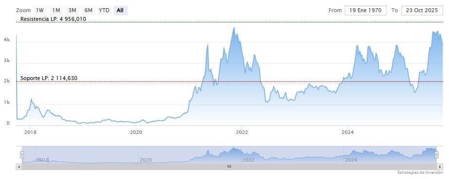 Con el índice de fuerza relativa (RSI) en 46 y señalando una divergencia al alza, una nueva prueba exitosa y una continuación por encima de los 4.000 dólares podrían poner en juego los 4.300 y 4.500 dólares.