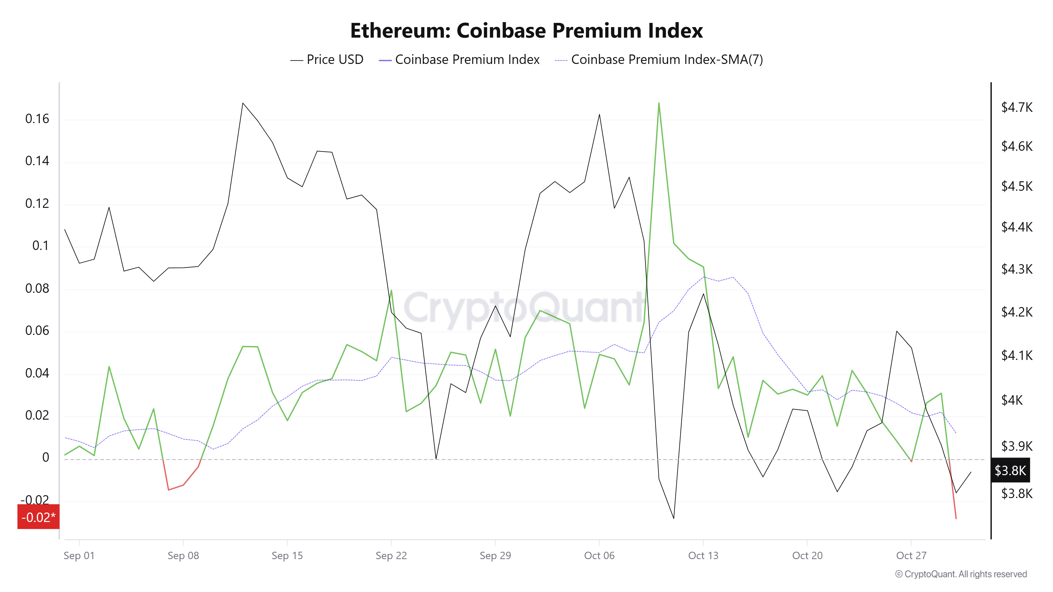 El Índice de Prima de Coinbase de Ethereum se hundió en territorio negativo por primera vez desde el 9 de septiembre el jueves, alcanzando -2.8%, según datos de CryptoQuant. La caída muestra que ETH se está negociando a un precio más bajo en Coinbase que en la mayoría de los intercambios de criptomonedas, lo que indica una desaceleración en la demanda al contado de los inversores estadounidenses.