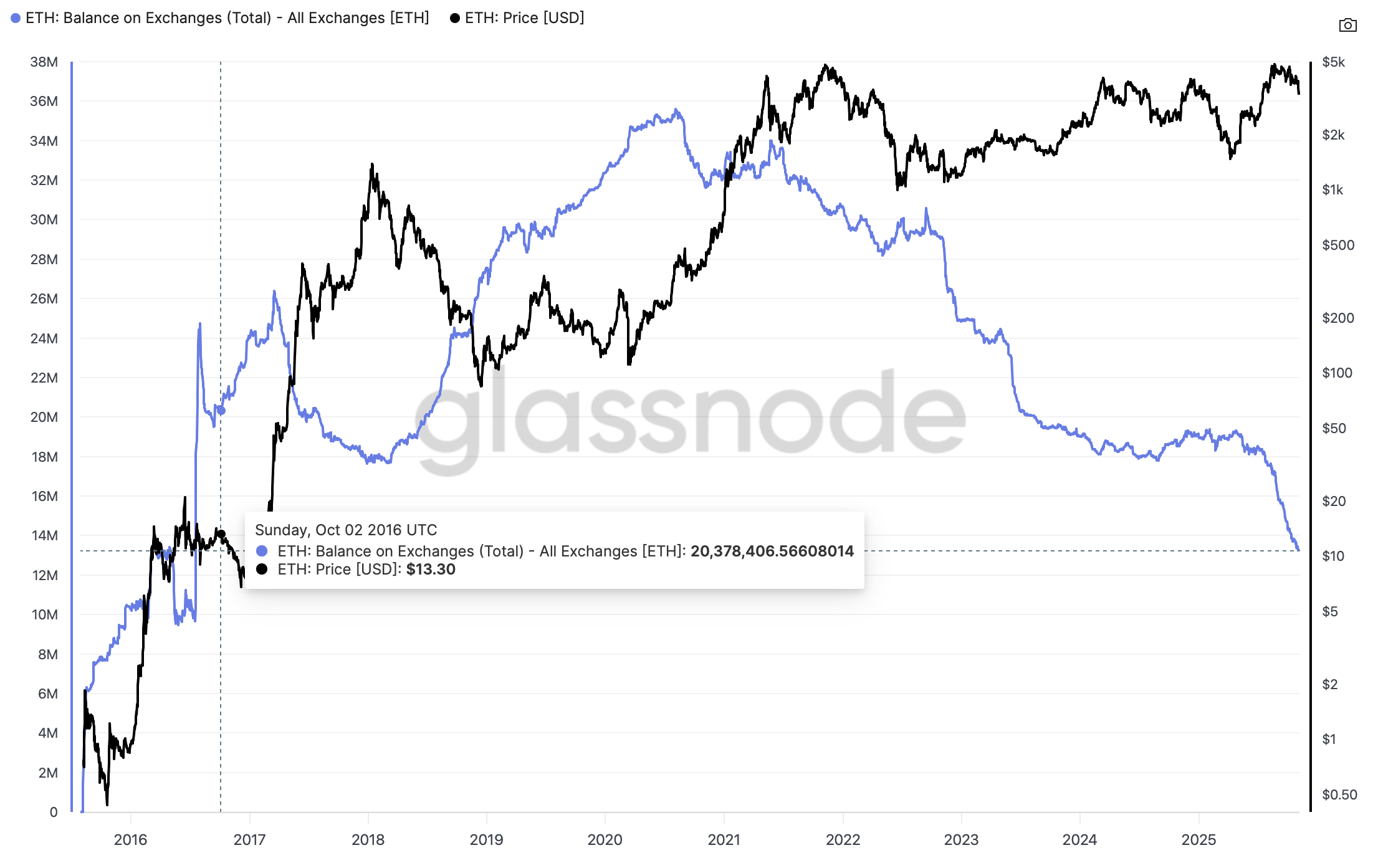El saldo de Ethereum en los intercambios alcanzó un pico de aproximadamente 35,5 millones de ETH en agosto de 2020 y ha disminuido constantemente a 13,3 millones de Ethereum hasta el miércoles, según Glassnode.
