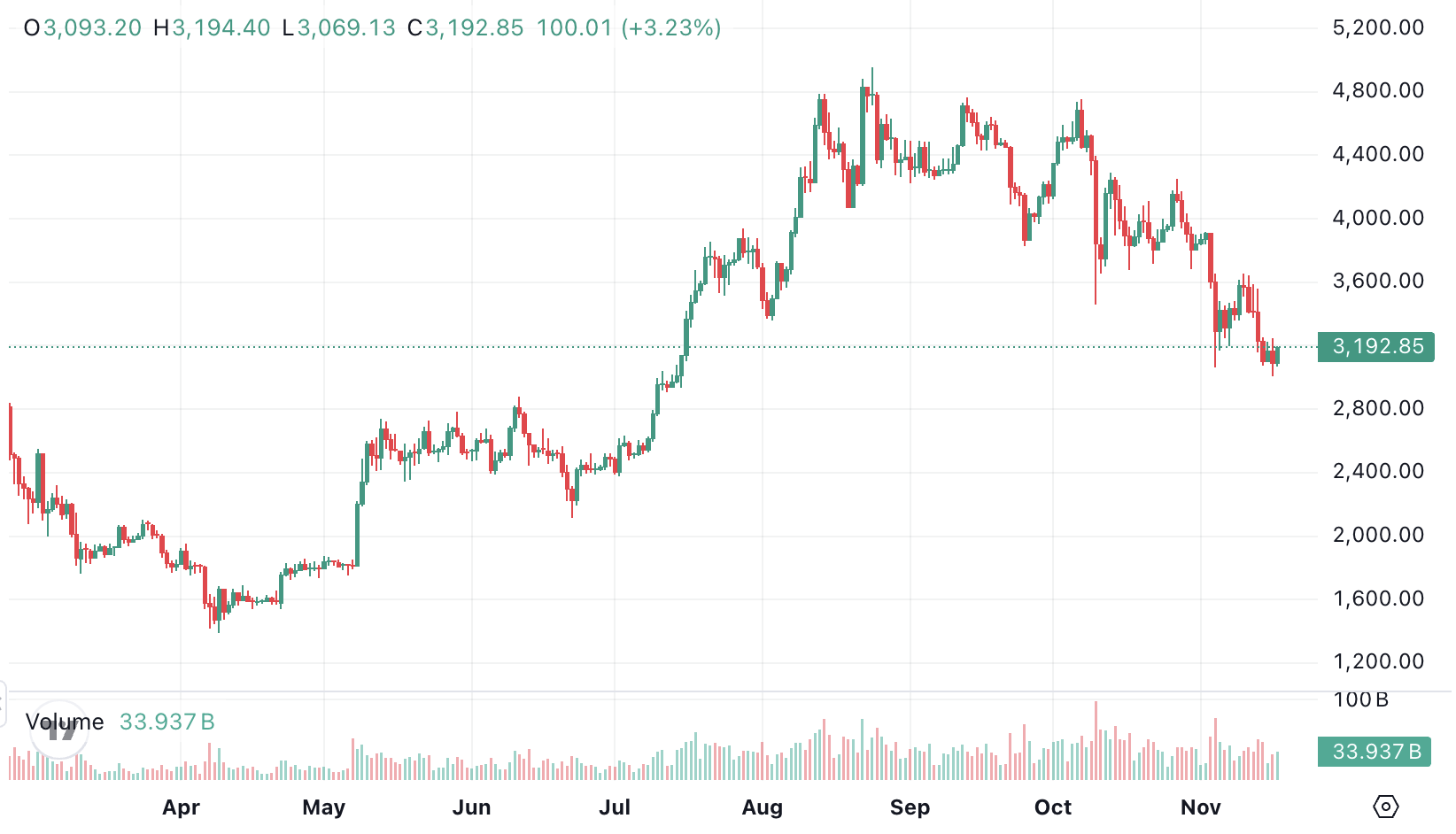 La altcoin más grande, Ethereum (ETH), ha experimentado una semana tumultuosa, con su precio cayendo por debajo de $3,100, un nivel que no se veía desde el 4 de noviembre. Esta caída se produce en medio de una ola de mercado más amplia que ha desestabilizado todo el panorama de la criptomoneda. Los datos de CryptoAppsy revelan una disminución del 0,47% en el valor de ETH en las últimas 24 horas, ahora cotizando a $3,193. Los analistas han señalado que las salidas significativas de los ETFs de Ethereum al contado indican una notable disminución en la confianza de los inversores.