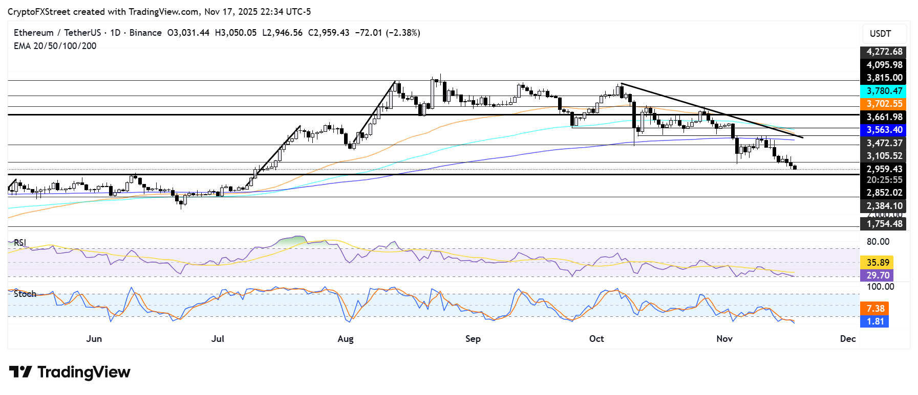 Pronóstico del Precio de Ethereum: ETH apunta a 2.850$ tras romper el soporte de 3.100$