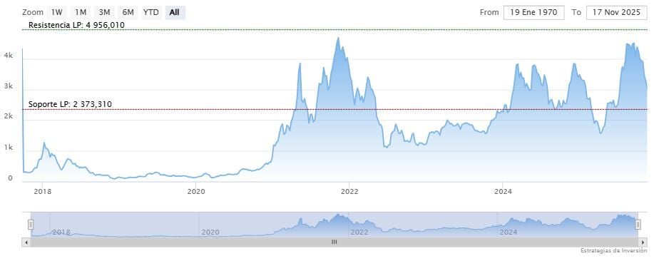 “Pero otra forma de ver Ethereum es a través de su ratio de precio, o incluso su ratio de valor de red, respecto a Bitcoin. Actualmente se sitúa en 0.032. El promedio a largo plazo, como el de los últimos 8 años, si operáramos basándonos únicamente en ese promedio, situaría a Ethereum en torno a los 12.000 dólares.