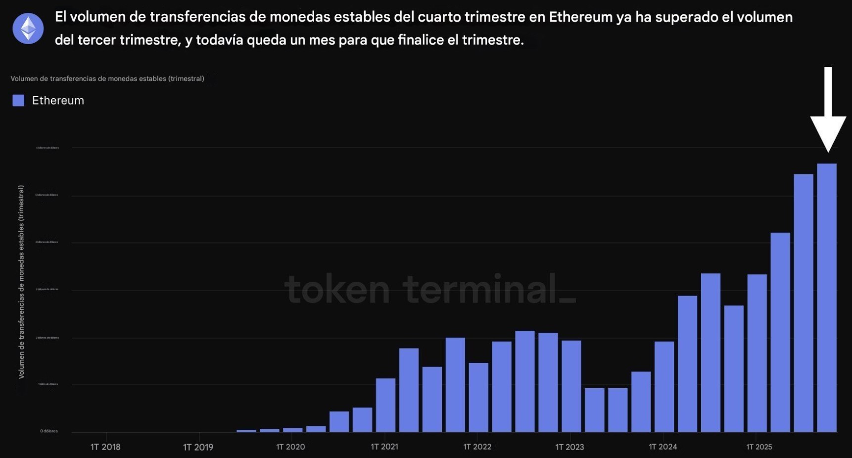 El volumen de transferencias de stablecoins alojadas en la red Ethereum alcanzó casi USD 6 billones durante el cuarto trimestre del año. Un nivel que ya supera los montos trimestrales procesados por Visa y Mastercard.