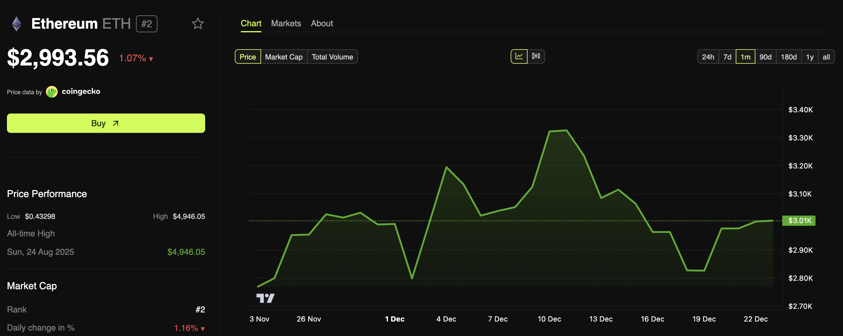 La compra de BitMine ocurre mientras ETH y el mercado en general siguen enfrentando volatilidad. La criptomoneda perdió nuevamente de la marca de 3,000 dólares durante las primeras horas de trading en Asia y ha caído más del 1% en las últimas 24 horas.