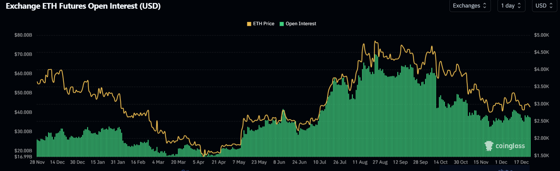 Desde 26.83 mil millones de dólares en enero, el interés abierto de Ethereum se disparó más del 160% a 70.13 mil millones de dólares en agosto. Sin embargo, se desplomó más del 53% a un mínimo de 32.57 mil millones de dólares en noviembre tras el desalojo de apalancamiento del 10 de octubre. La cifra ha aumentado ligeramente a 37.37 mil millones de dólares en diciembre.
