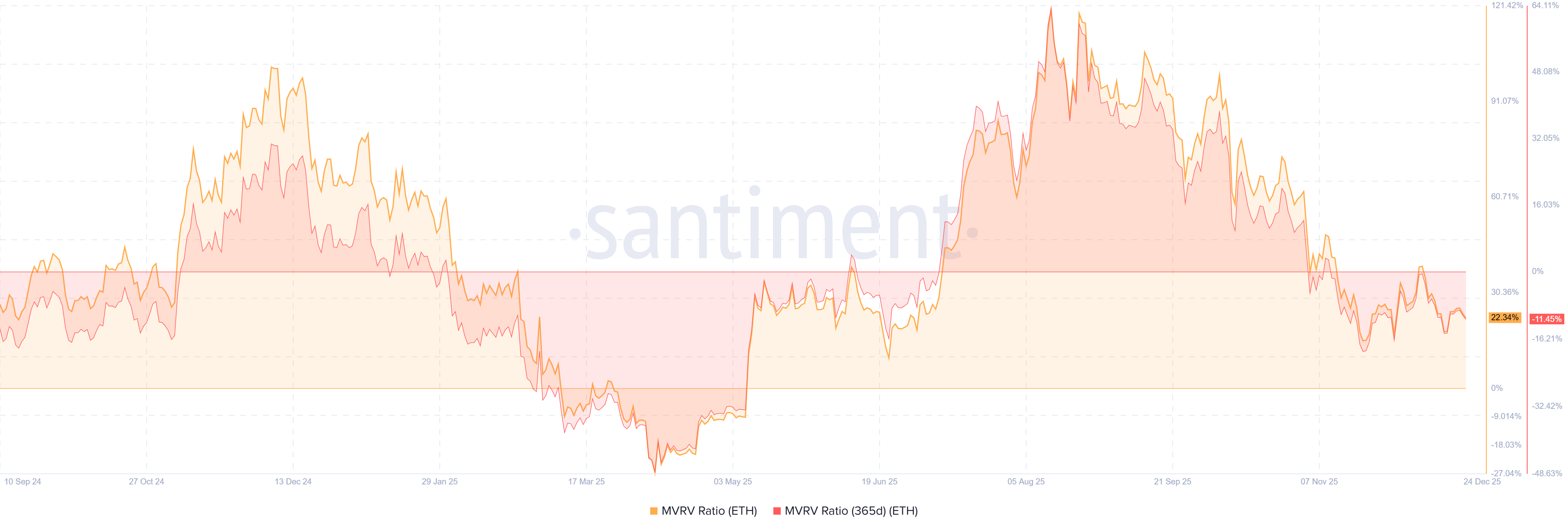 El MVRV a 365 días muestra que todas las billeteras que compraron ETH en 2025 están sufriendo una pérdida del 11%. Mientras tanto, la relación MVRV inclusiva revela que todos los inversores están manteniendo una ganancia del 22%.