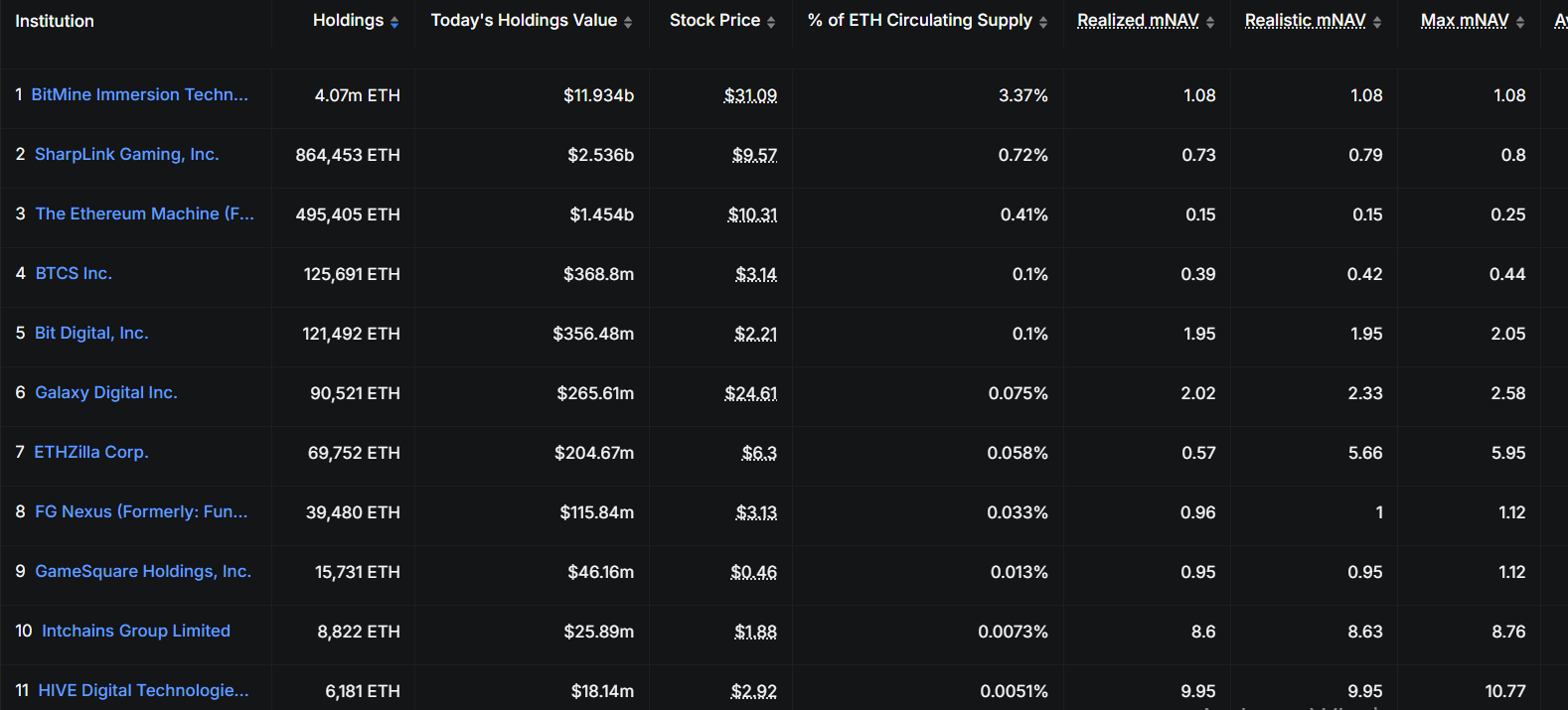 Sin embargo, los buenos tiempos llegaron a su fin tras el desalojo de apalancamiento de criptomonedas del 10 de octubre, que provocó una caída en todo el mercado. ETH se desplomó aproximadamente un 45% entre octubre y noviembre, pero las acciones de las tesorerías de criptomonedas vieron caídas más pronunciadas, empujando sus ratios de valor de mercado a activos netos (mNAV) a la sombra.