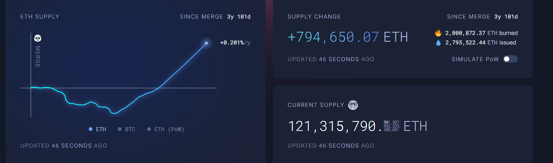 Como resultado, la cantidad de ETH quemado en Ethereum continúa disminuyendo, empujando la oferta total hacia arriba.