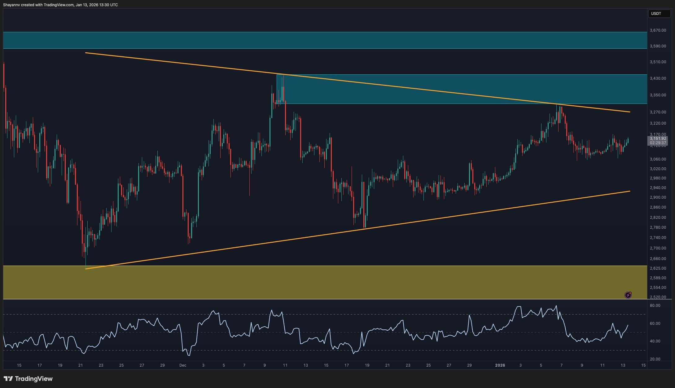La resistencia de corto plazo se sitúa alrededor de los máximos previos en $3.300, que también queda cerca del límite superior del canal. El soporte está bien definido a lo largo del límite inferior del triángulo y, más abajo, en la zona de demanda más amplia en $2.600.