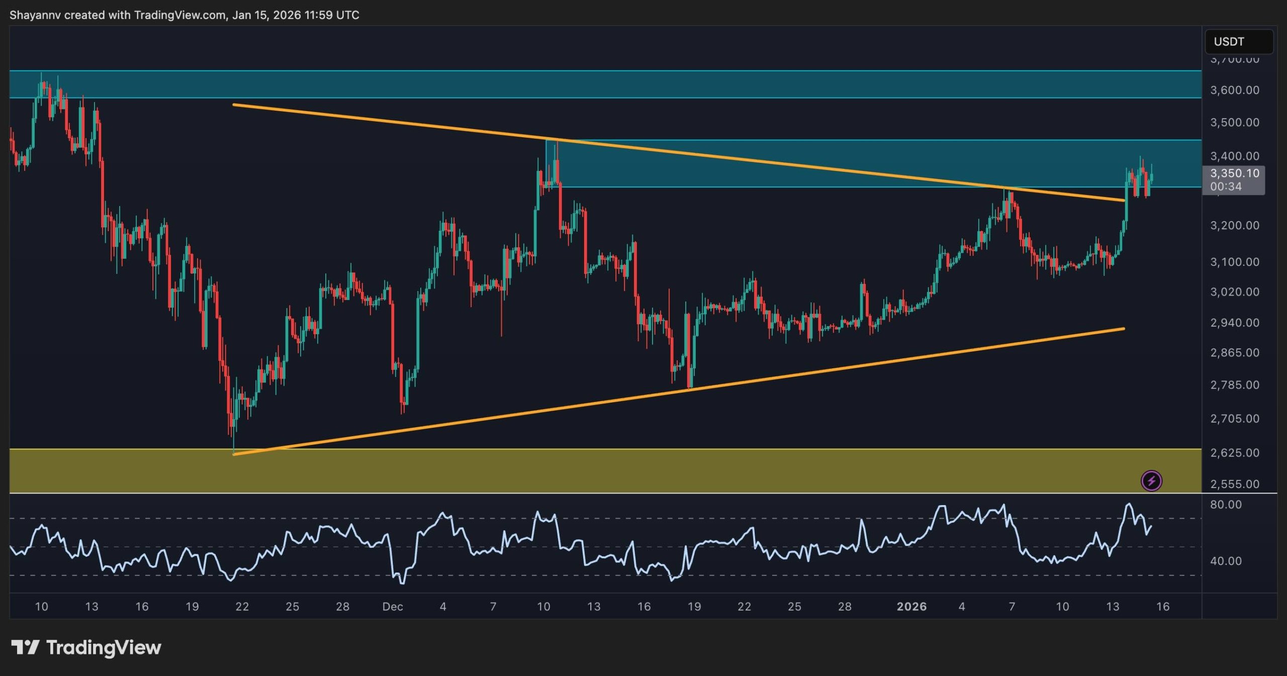 Sin embargo, el RSI está retrocediendo desde la zona de sobrecompra, lo que indica que es probable una consolidación o un pullback antes de que continúe el rally. Mientras el precio se mantenga por encima del patrón ya roto, sigue siendo probable una continuación hacia el rango de $3.600 a $3.700. En cambio, una caída por debajo de $3.200 invalidaría la estructura alcista inmediata y podría activar un retroceso hacia el nivel de $3.000, e incluso más abajo.