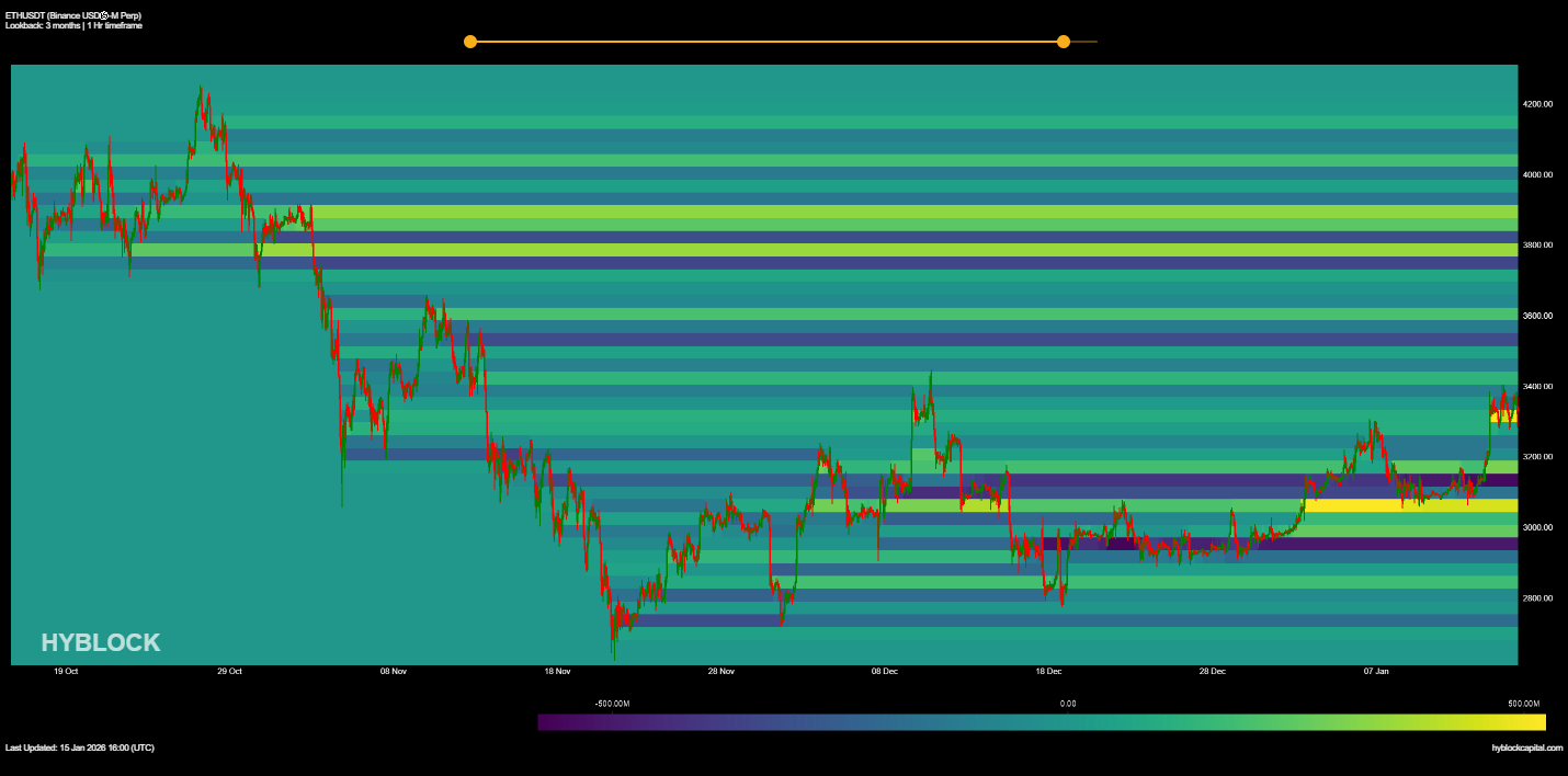 Apoyando esta visión, los datos de Hyblock muestran una concentración neta de posiciones largas por encima de 500 millones de dólares entre 3.040 dólares y 3.100 dólares. Un posicionamiento tan denso aumenta la probabilidad de una barrida a corto plazo en este rango, lo que podría sentar las bases para un movimiento de continuación más fuerte posteriormente.