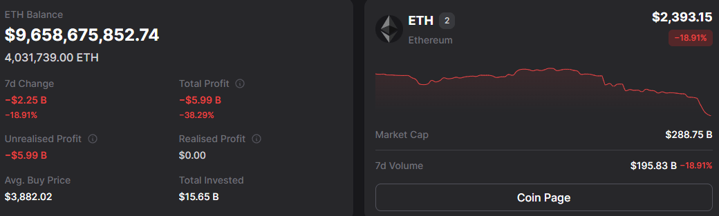 Sin embargo, la reciente caída de $ETH hasta la zona de los $2.250 provocó un deterioro significativo del portafolio, con una depreciación cercana al 40% y una pérdida no realizada que ya ronda los $6.000 millones.