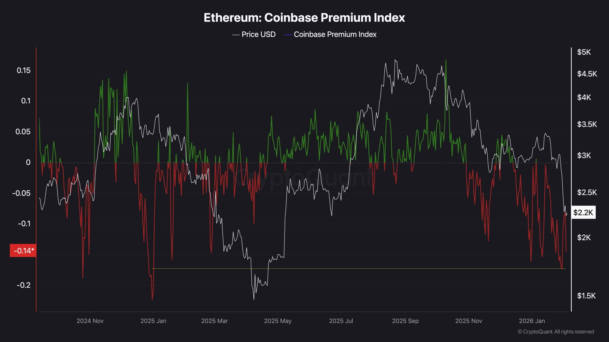 El índice Coinbase Premium de Ethereum se encuentra actualmente en terreno profundamente negativo y ha caído a niveles vistos por última vez en los grandes mínimos de mercado del año pasado, lo que señala un claro estado bajista del sentimiento. Este descuento persistente refleja una presión vendedora sostenida por parte de inversores con base en EE. UU., con Ethereum cotizando más barato en Coinbase que en exchanges offshore.