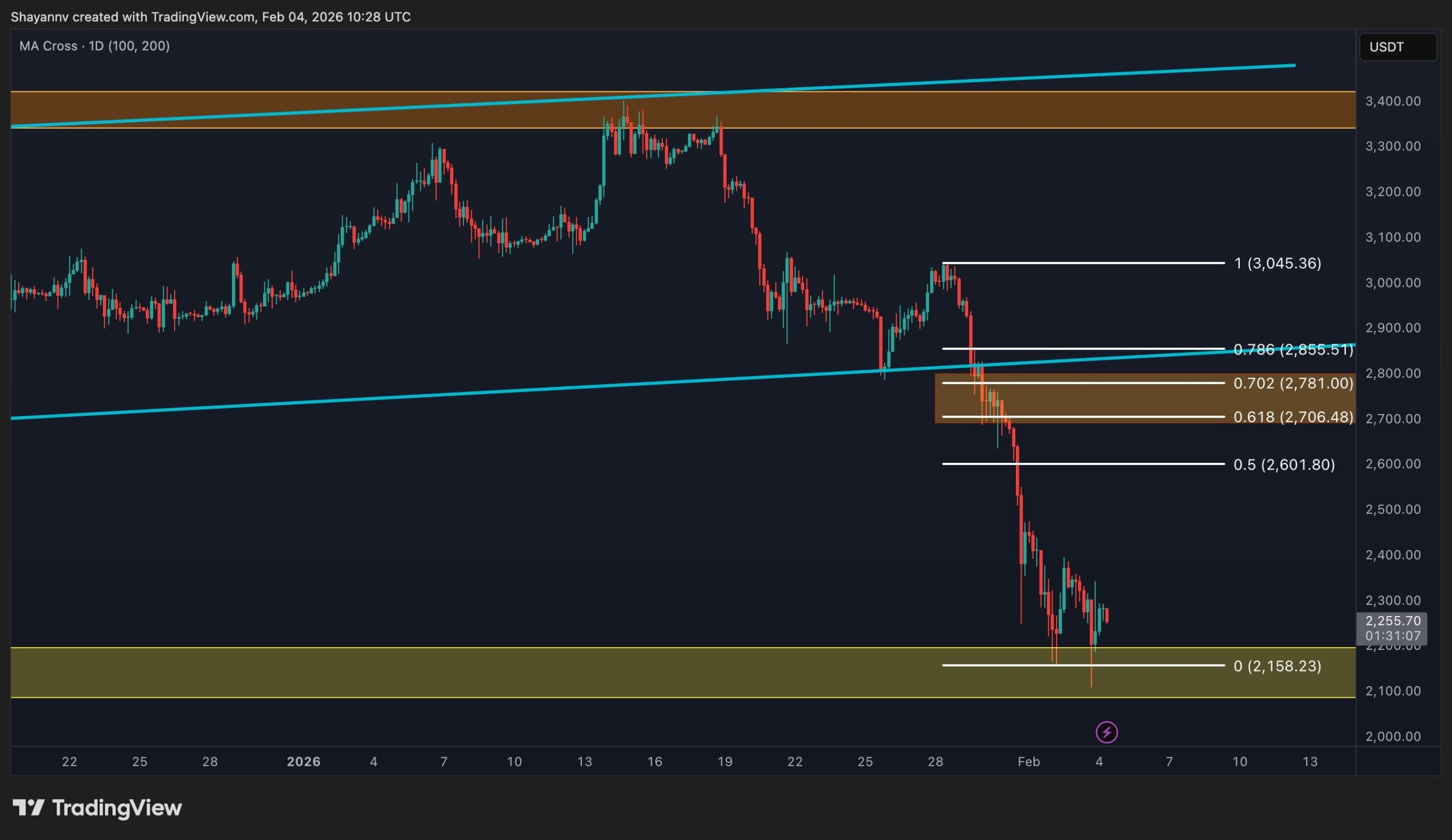 En el marco temporal diario, Ethereum ha alcanzado una zona de soporte crítica en torno a los $2.000, que coincide con un mínimo anual previo relevante y con una región de demanda históricamente significativa. Este nivel ha funcionado antes como una base sólida de acumulación, y la reacción actual del mercado sugiere una mayor sensibilidad entre los participantes.