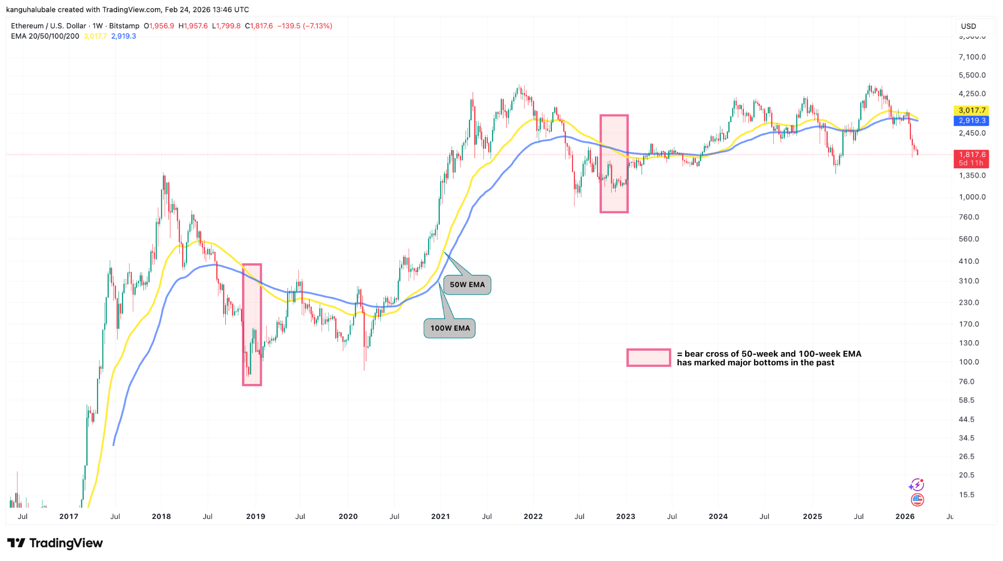 La historia muestra que $ETH no encontró un fondo hasta que la media móvil exponencial (EMA) de 50 semanas cruzó por debajo de la EMA de 100 semanas. Este tipo de cruce ha marcado el final de cada gran mercado bajista, incluidos los de 2022 y 2018, como se muestra en el gráfico a continuación.