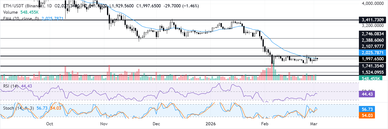 En el gráfico diario, $ETH cotiza a 1.980$. La tendencia a corto plazo se mantiene levemente bajista ya que el precio se mantiene por debajo de la Media Móvil Exponencial (EMA) de 20 días cerca de 2.025$, manteniendo el spot limitado por debajo del indicador de tendencia a corto plazo.