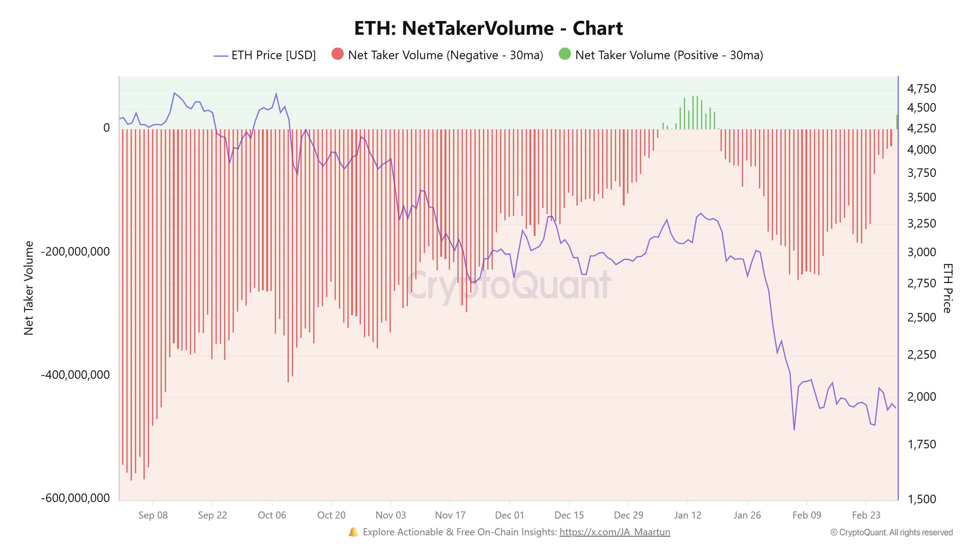 Al mismo tiempo, el Volumen Neto de Taker de futuros de $ETH en la plataforma de intercambio de criptomonedas Binance muestra que la dominancia de posiciones cortas se contrajo drásticamente en la última semana. La métrica rastrea la diferencia en volúmenes entre compradores y vendedores que adquieren contratos de futuros de $ETH a través de órdenes de mercado.
