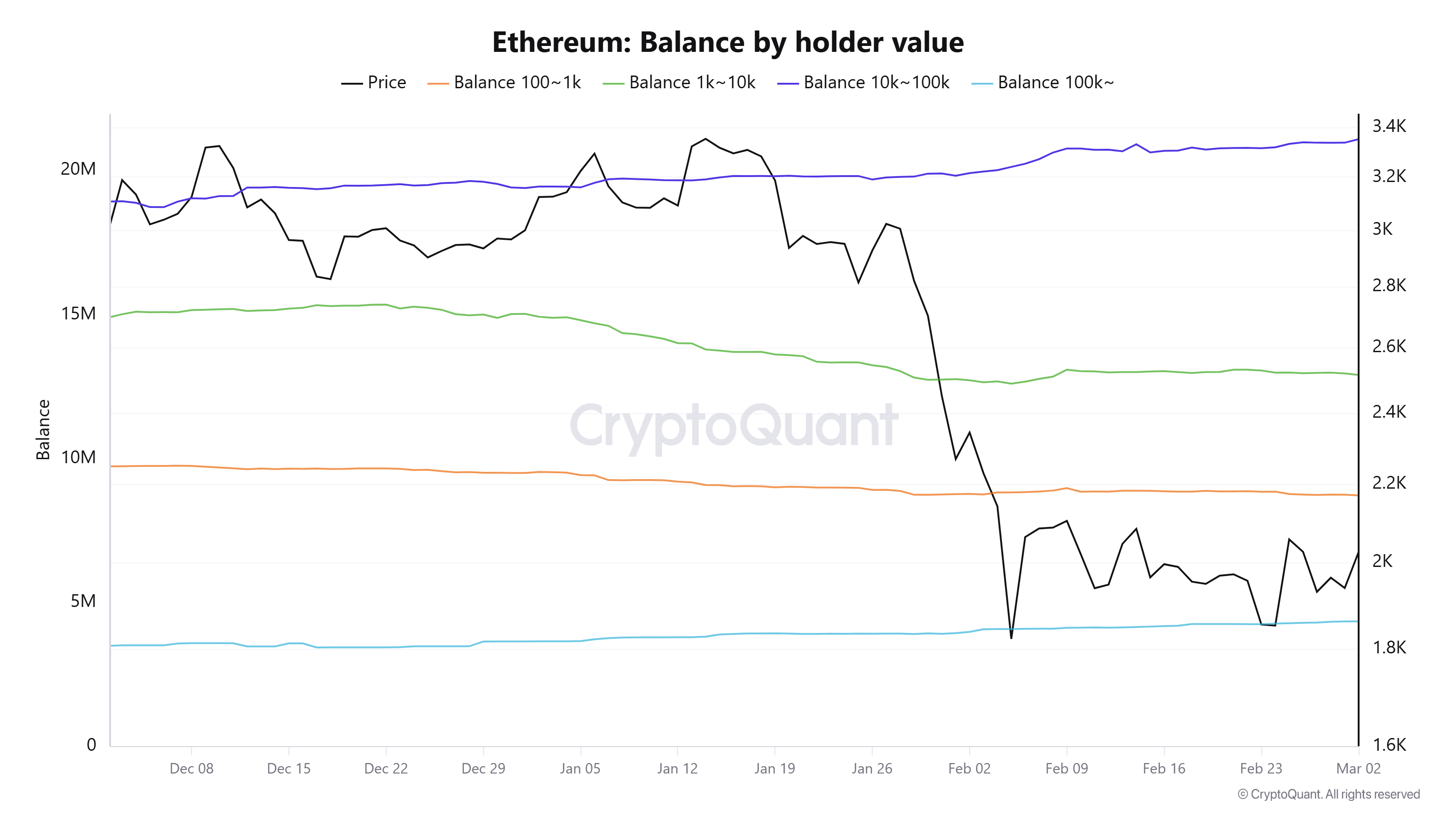 Por otro lado, los minoristas o carteras que poseen entre 100-1K y 1K-10K $ETH descargaron colectivamente 210K $ETH durante el período, continuando su patrón reactivo a la sentiment del mercado.