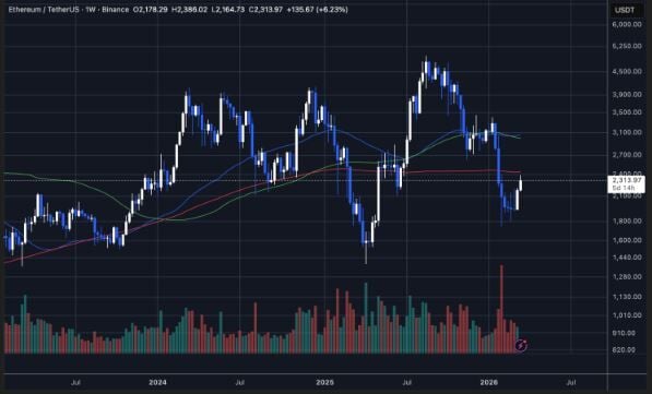 El gráfico semanal de Ethereum muestra que el activo intenta recuperar fuerza tras una fuerte corrección a principios de 2026. Actualmente, $ETH cotiza cerca de los 2.310 dólares, tras un fuerte repunte desde los mínimos de febrero, cuando el precio cayó brevemente hacia la región de los 1.600 dólares antes de que los compradores intervinieran agresivamente.