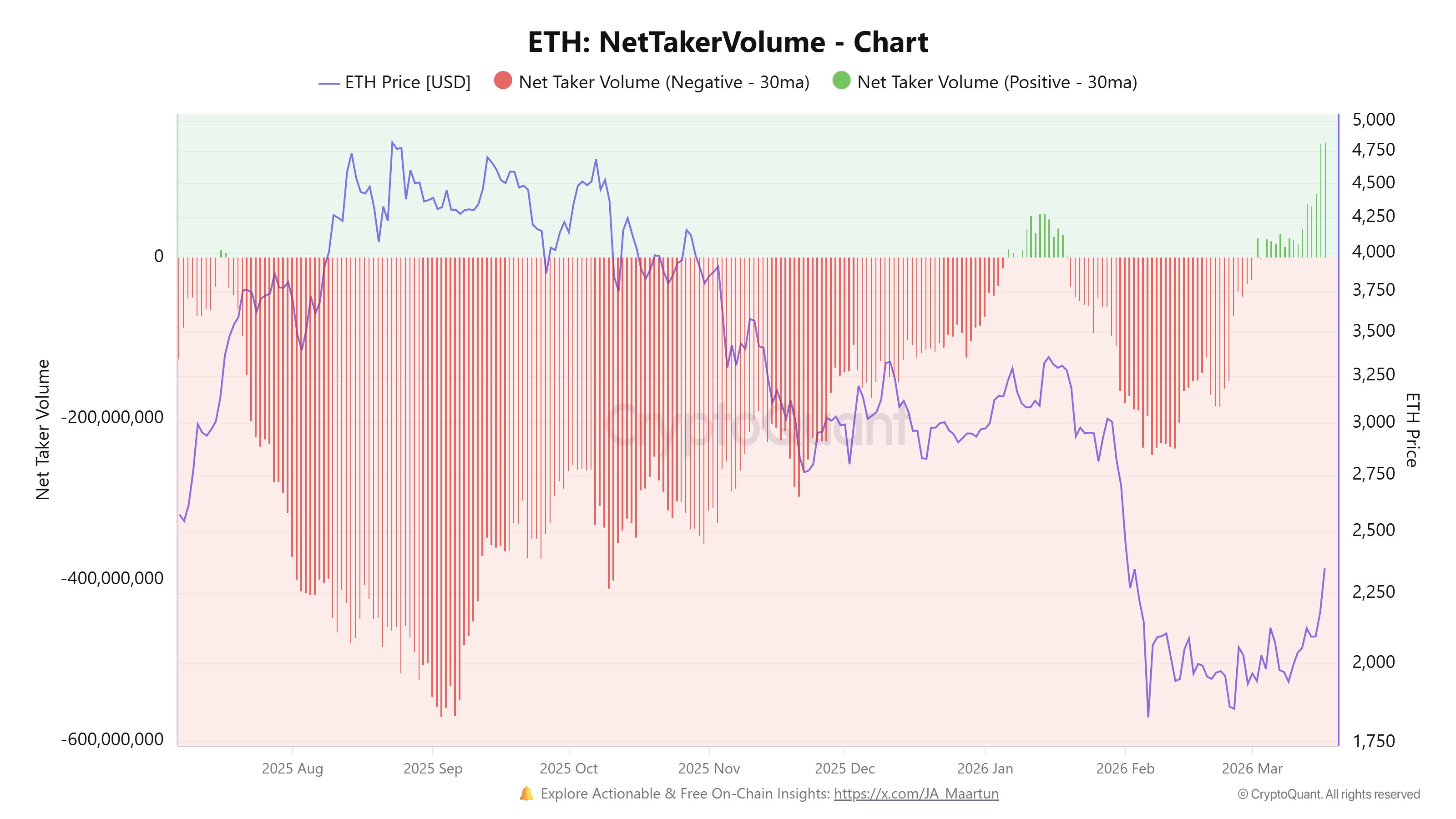 Aunque las posiciones se han inclinado en gran medida hacia las cortas en los últimos meses, un aumento constante en el Volumen Neto de Toma de $ETH en Binance, que subió a 142.5 millones de dólares el martes, muestra que las operaciones largas están recuperando dominio.