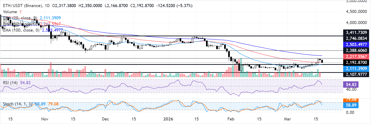 $ETH está al borde de caer por debajo de la media móvil exponencial (EMA) de 50 días tras ver un rechazo en la resistencia cerca de 2.390$.