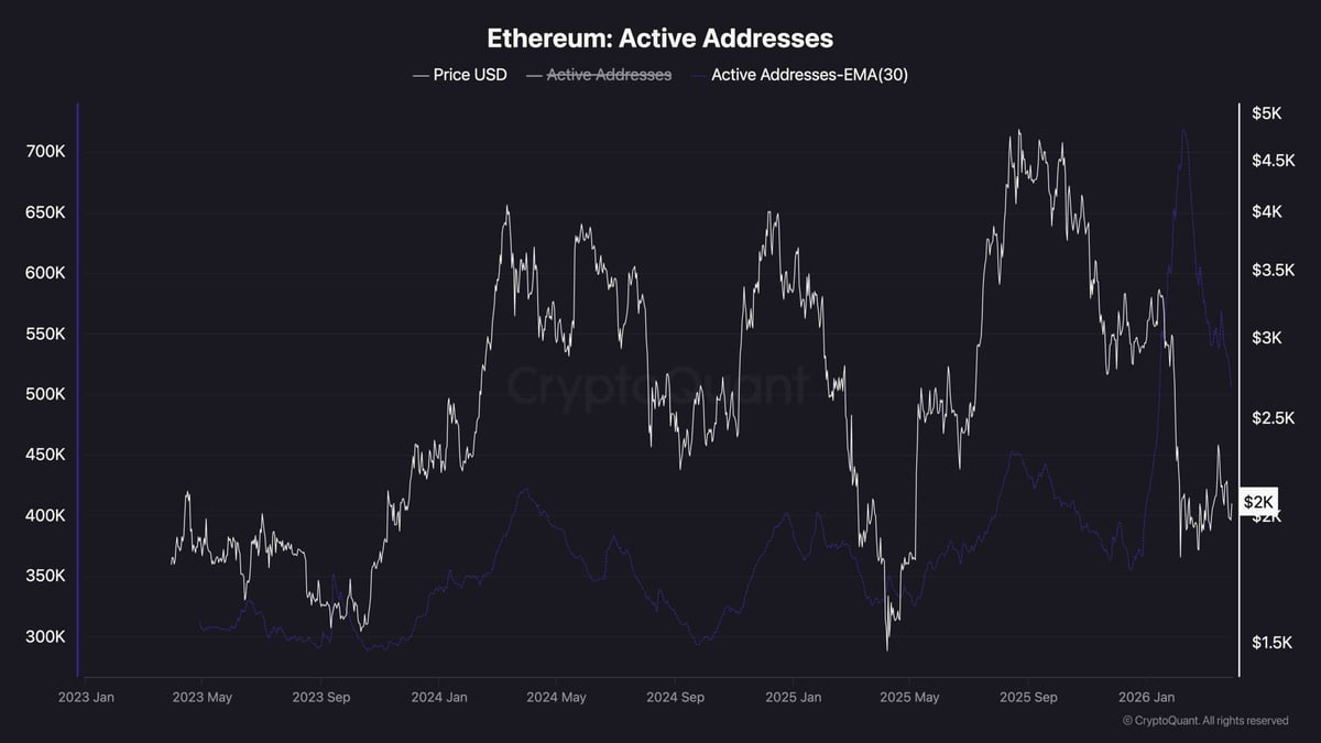 El número de direcciones activas de Ethereum mostró un repunte notable durante la caída de febrero y en torno a los mínimos posteriores, disparándose muy por encima de los niveles vistos en los dos últimos años.