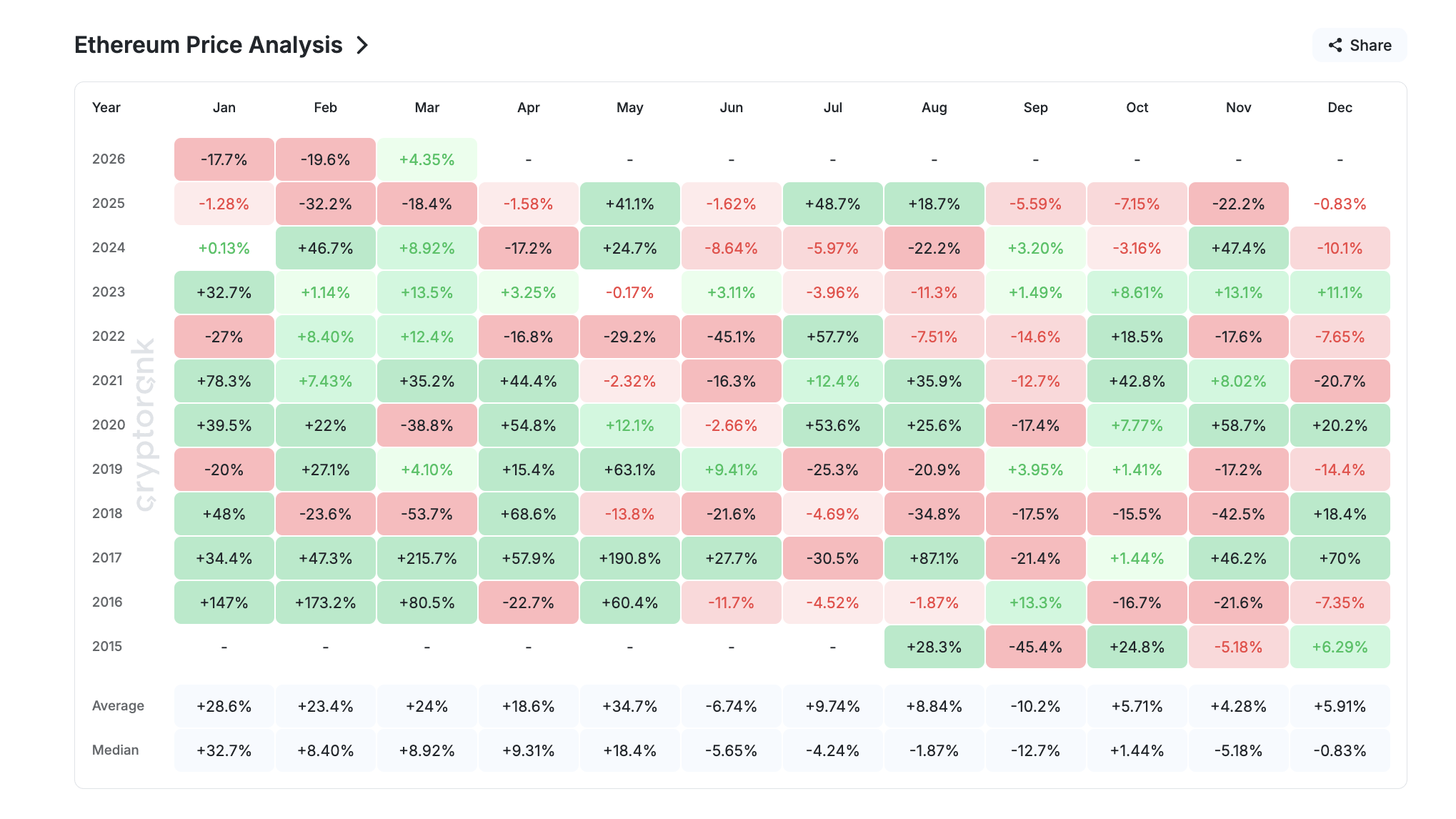 El precio de Ethereum no ha tenido un cierre mensual positivo desde agosto de 2025. Marzo va encaminado a romper esa tendencia, aunque las ganancias siguen siendo modestas. Históricamente, abril está entre los mejores meses para $ETH, con rendimientos promedio de 18% y rendimientos medianos superiores a 9%.