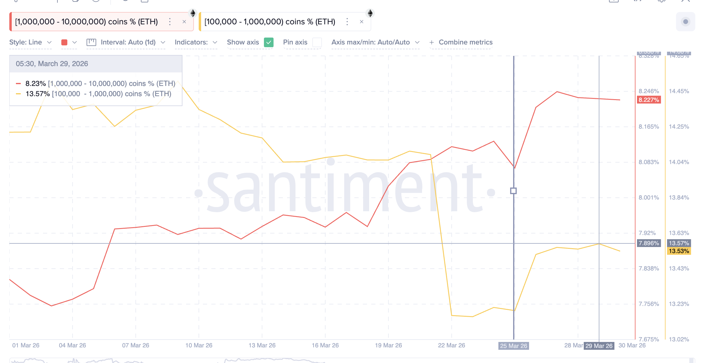 El comportamiento de las ballenas de Ethereum añade matices. Dos de las mayores cohortes, es decir, las wallet que tienen entre 1 millón y 10 millones de $ETH y las que tienen entre 100,000 y 1 millón de $ETH, aumentaron su porcentaje de suministro desde el 25 de marzo. El grupo grande pasó de 8,07% a 8,22% del suministro. El grupo menor subió de 13,19% a 13,53%.