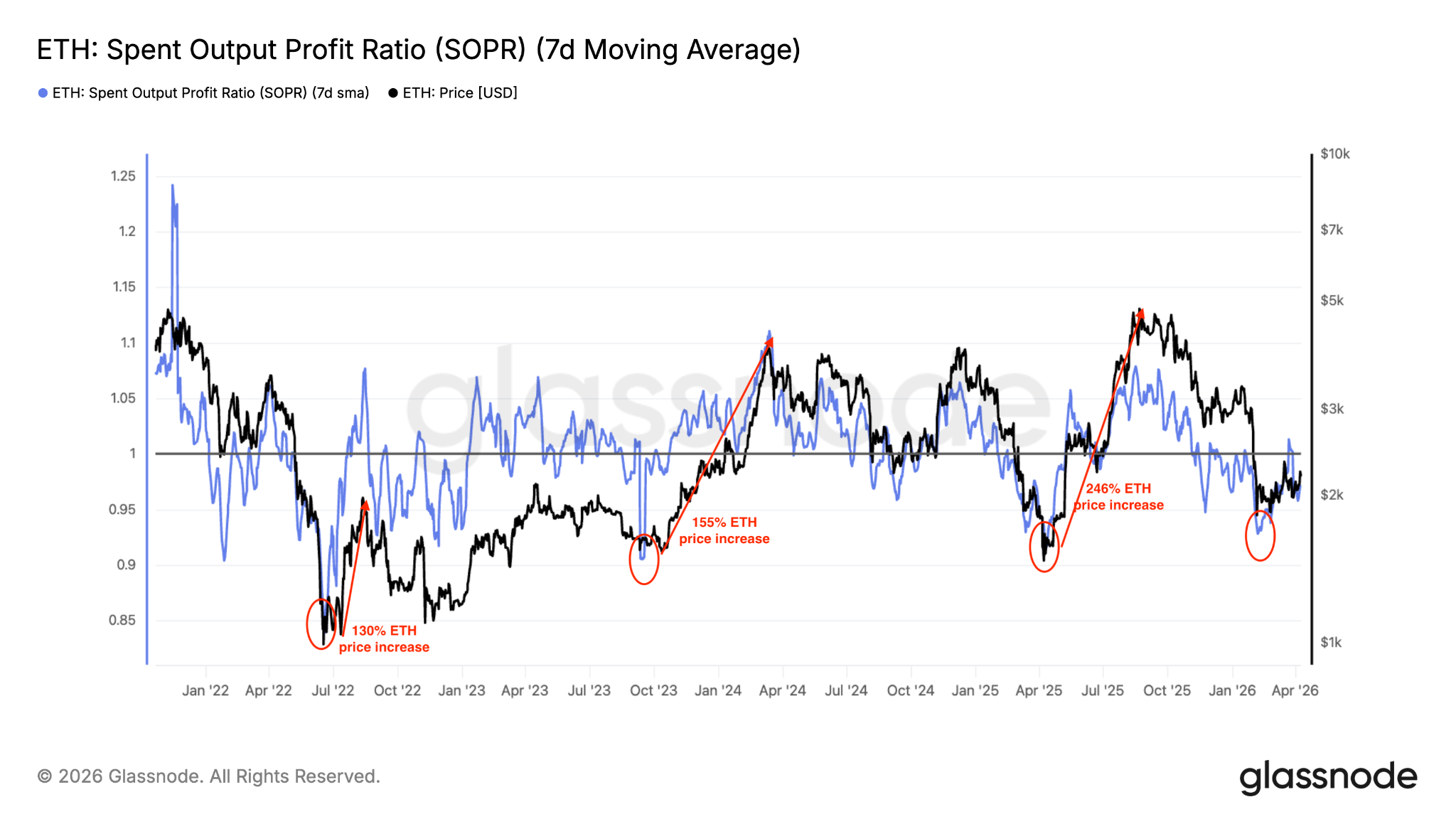 Históricamente, este escenario ha precedido a menudo a las recuperaciones de precios. Cuando el SOPR cayó a 0.86 tras la caída de Ether a 1.500 dólares en abril, le siguió una recuperación del precio del 246% hasta su actual máximo histórico de 4.950 dólares.