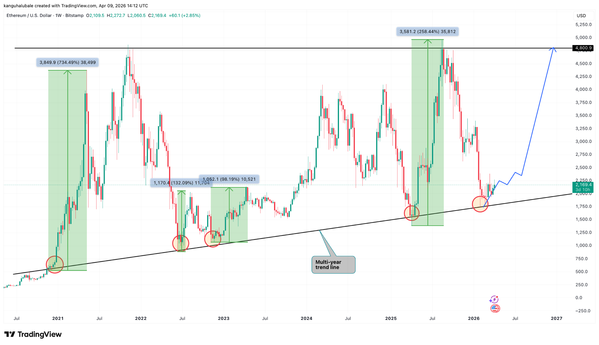 El precio de $ETH rebotó en una línea de tendencia de varios años que ha marcado mínimos macro anteriores.