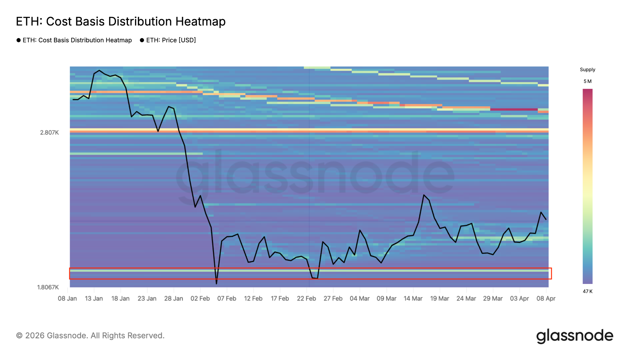 Esta es la zona alrededor de 1.800 dólares, donde los inversores adquirieron más de 1,35 millones de $ETH, según el mapa de calor de distribución del costo base de Glassnode.